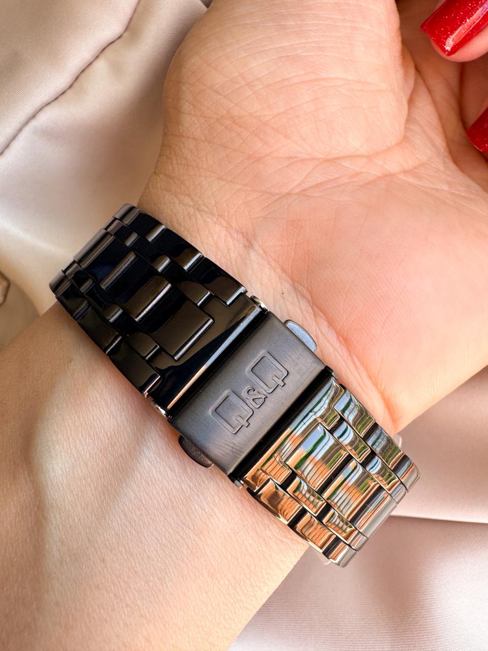 Reloj Q&Q Unisex negro y oro rosa con calendario