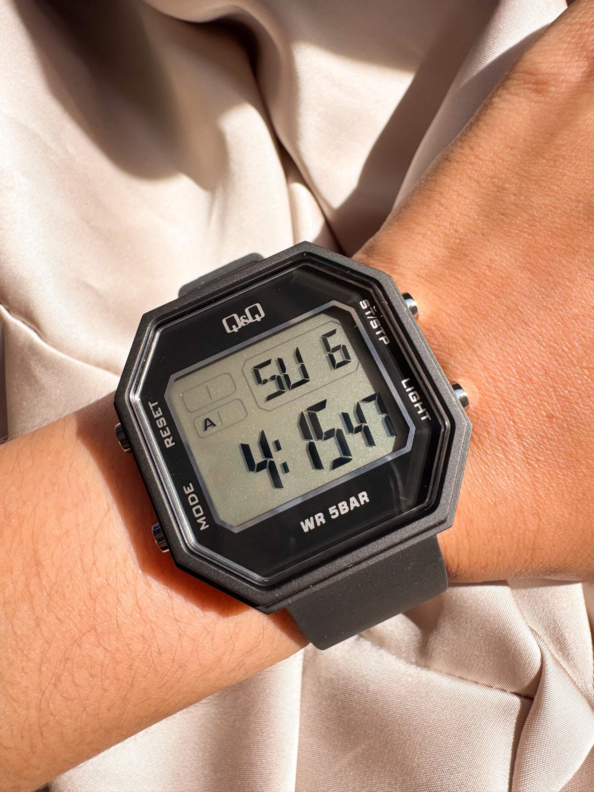 Q y Q ORIGINAL unisex, incluye estuche, resistencia al agua: 5 BAR Water resist (NO SUMERGIBLE) 12 meses de garantía, funciones: Hora digital, Hora militar 24 horas, Cronometro, Alarma, Fecha, Luz Nocturna, ancho de la caja 3.9 cm, Alto de la caja 4 cm, Ancho del pulso 2,2 cm, Material del reloj: Caja en acrílico y pulso en plástico.