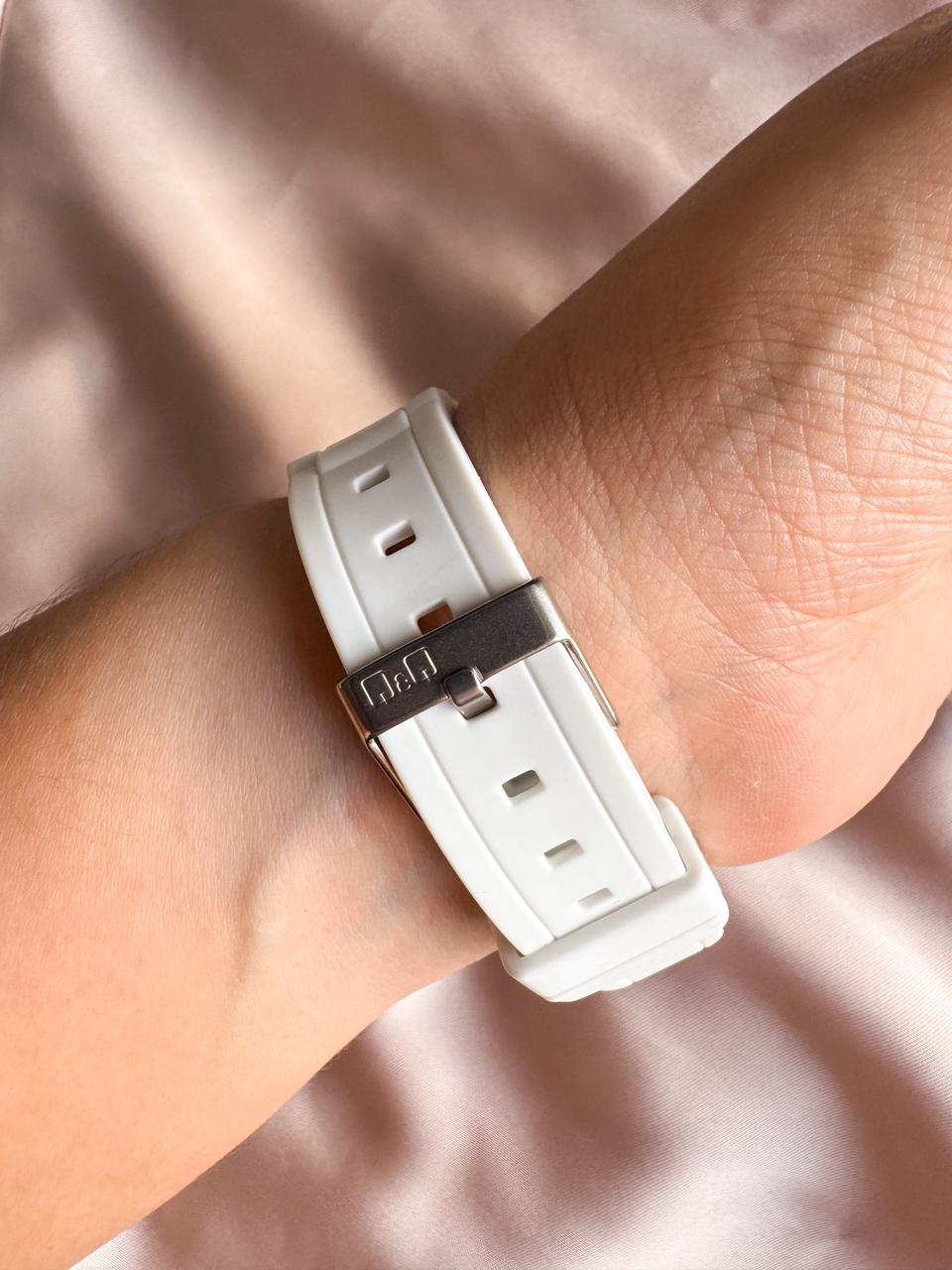 Reloj blanco (borde plateado) mujer incluye estuche Resistente al agua: 5 BAR (no sumergible) nuestro relojes q&q tienen 12 meses de garantía Funciones: Hora análoga, minutos, segundos Dimensiones del reloj: Diámetro de la caja 3,5 cm, Ancho del pulso 1,5cm Material del reloj Caja: Alloy Correa: silicona: cristal: Mineral