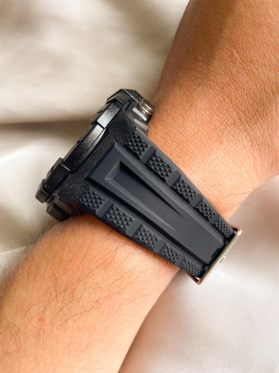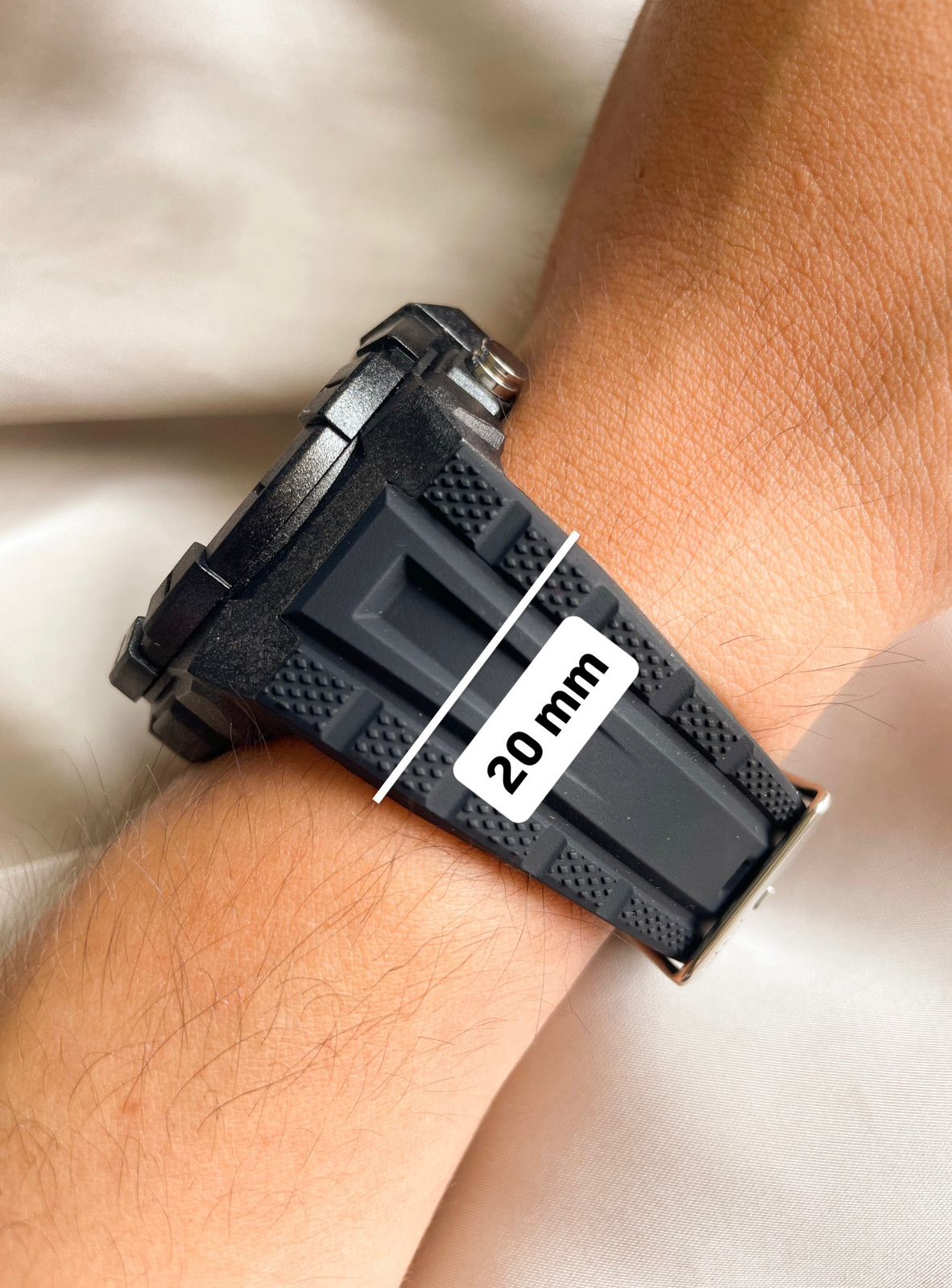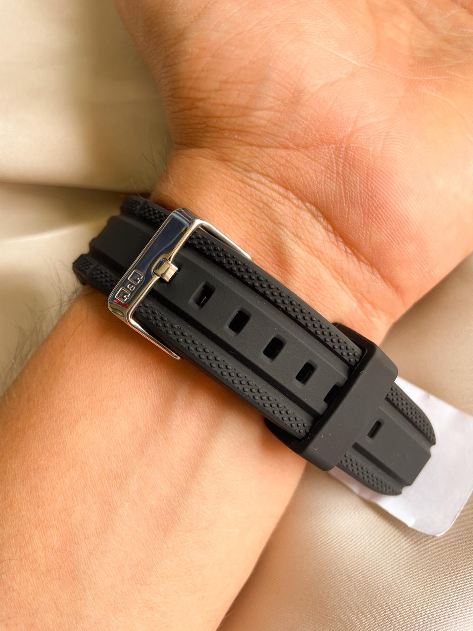 Reloj negro hombre (grande) incluye estuche Resistente al agua: 10 BAR (no sumergible) nuestro relojes q&q tienen 12 meses de garantía Funciones: Hora análoga, minutos, segundos (completamente funcional: 24 horas, segundero independiente) Dimensiones del reloj: Diámetro de la caja 4,6 cm, Ancho del pulso 2 cm Material del reloj Caja: Acrílico Correa: plástica: cristal: Mineral