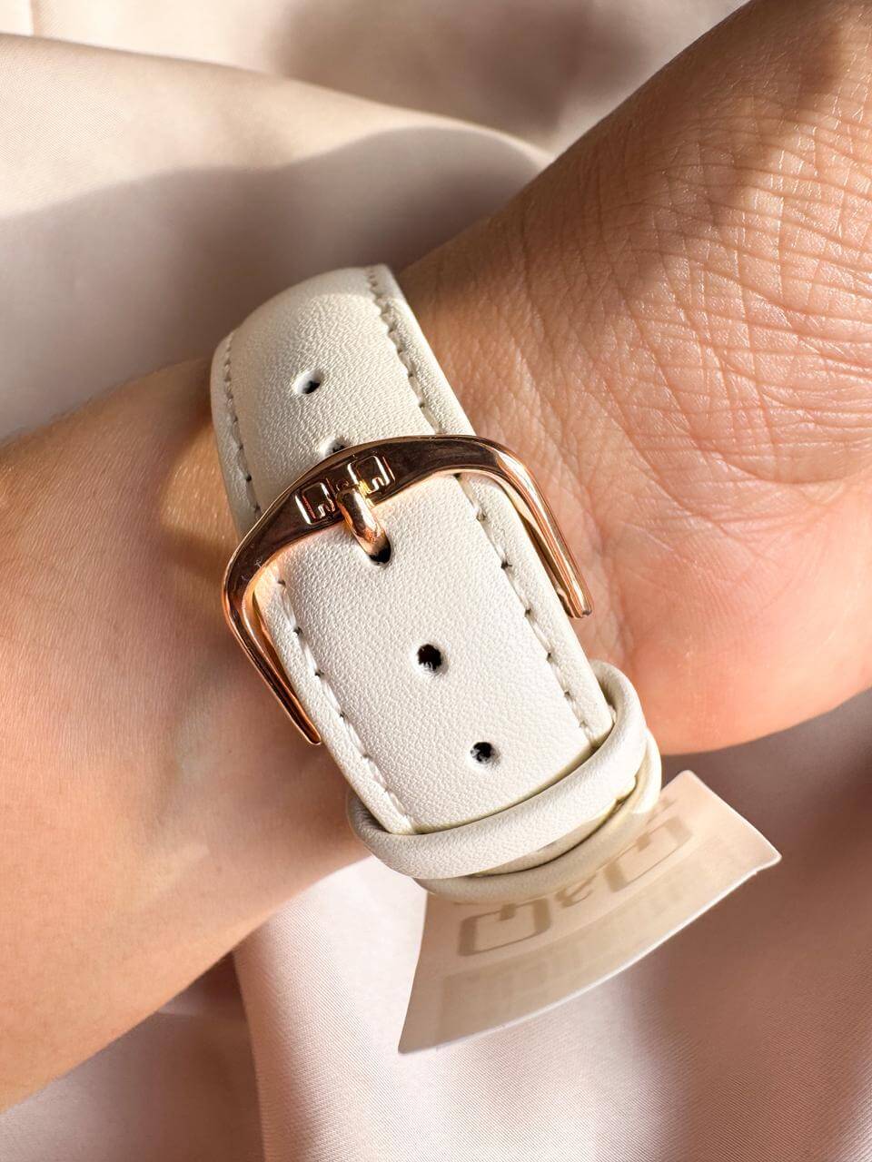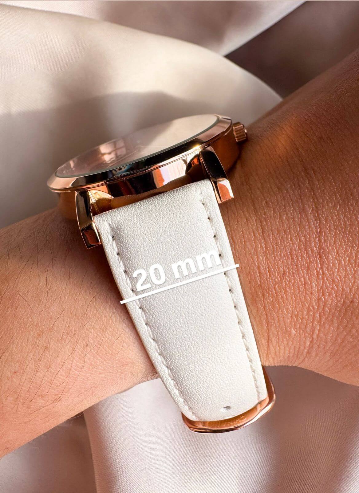Reloj blanco borde oro rosa mujer (grande) incluye estuche Resistente al agua: 3 BAR (no sumergible) nuestro relojes q&q tienen 12 meses de garantía Funciones: Hora análoga, minutos, segundos Dimensiones del reloj: Diámetro de la caja 4,2 cm, Ancho del pulso 2 cm Material del reloj Caja: Acrílico Correa: Cuero sintético: cristal: Mineral