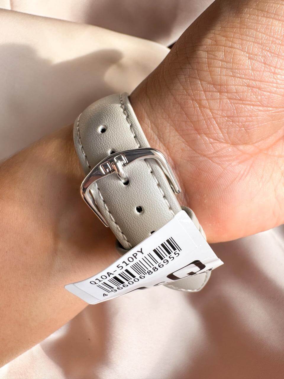 Reloj gris borde plateado mujer (grande) incluye estuche Resistente al agua: 3 BAR (no sumergible) nuestro relojes q&q tienen 12 meses de garantía Funciones: Hora análoga, minutos, segundos Dimensiones del reloj: Diámetro de la caja 4,2 cm, Ancho del pulso 2 cm Material del reloj Caja: Acrílico Correa: Cuero sintético: cristal: Mineral