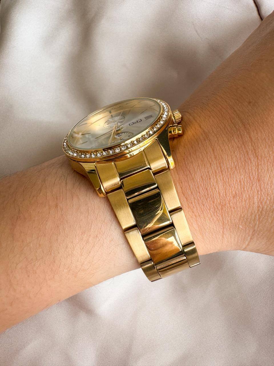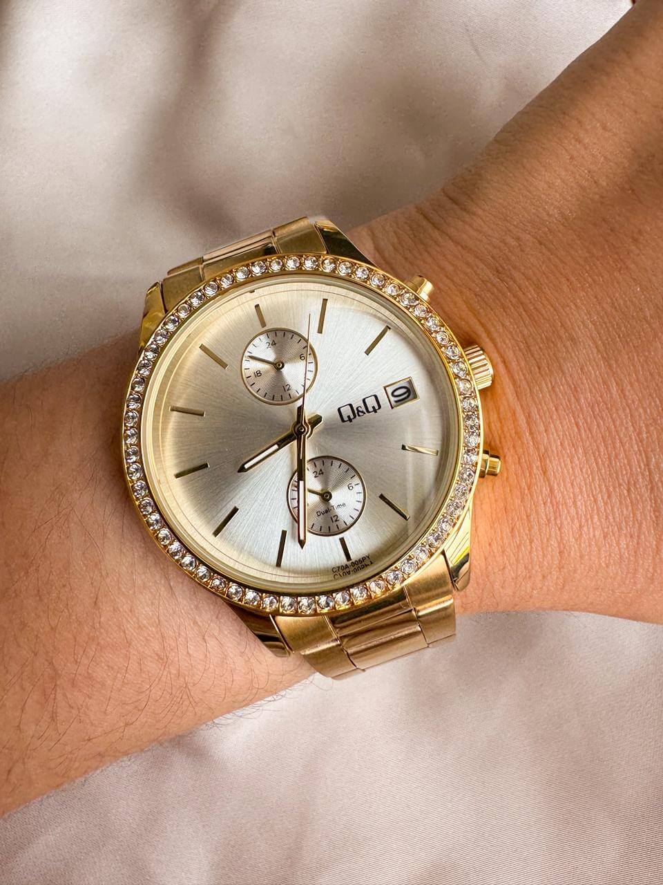 Q y Q ORIGINAL Mujer, incluye estuche, resistencia al agua: 5 BAR Water resist (NO SUMERGIBLE) 12 meses de garantía, funciones: Hora análoga: 3 manecillas, horas, minutos, segundos, Calendario: Numero del día, Hora militar: 24 horas. Diametro de la caja 3.6 cm, Ancho del pulso 1,6 cm, Material del reloj: caja en acero horneado y pulso en acero inoxidable.