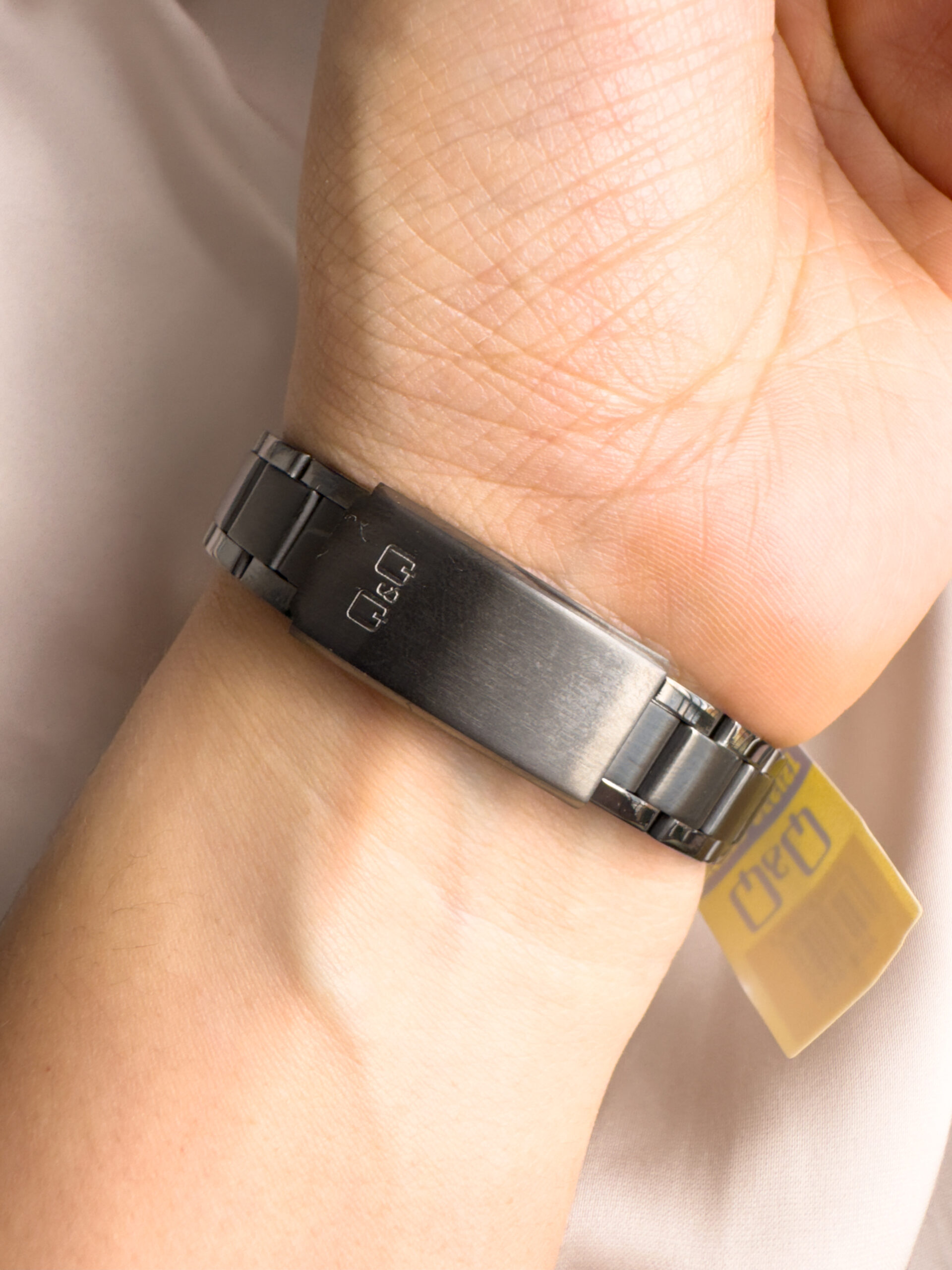 Q y Q ORIGINAL mujer, incluye estuche, resistencia al agua: 3 BAR Water resist (NO SUMERGIBLE) 12 meses de garantía, funciones: Hora analoga, minutos, segundos, Diametro de la caja 3 cm, Ancho del pulso 1,2 cm, Material del reloj: caja en acero horneado y pulso en acero inoxidable.