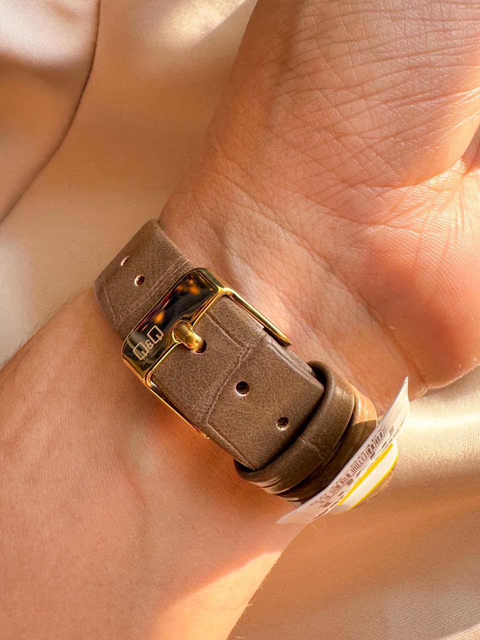 Reloj café mujer incluye estuche Resistente al agua: 3 BAR (no sumergible) nuestro relojes q&q tienen 12 meses de garantía Funciones: Hora análoga, minutos, segundos Dimensiones del reloj: diámetro del reloj 3,4 cm,  y Ancho del pulso 1,5 cm Material del reloj Caja: Alloy Correa: cuerina (sintético)