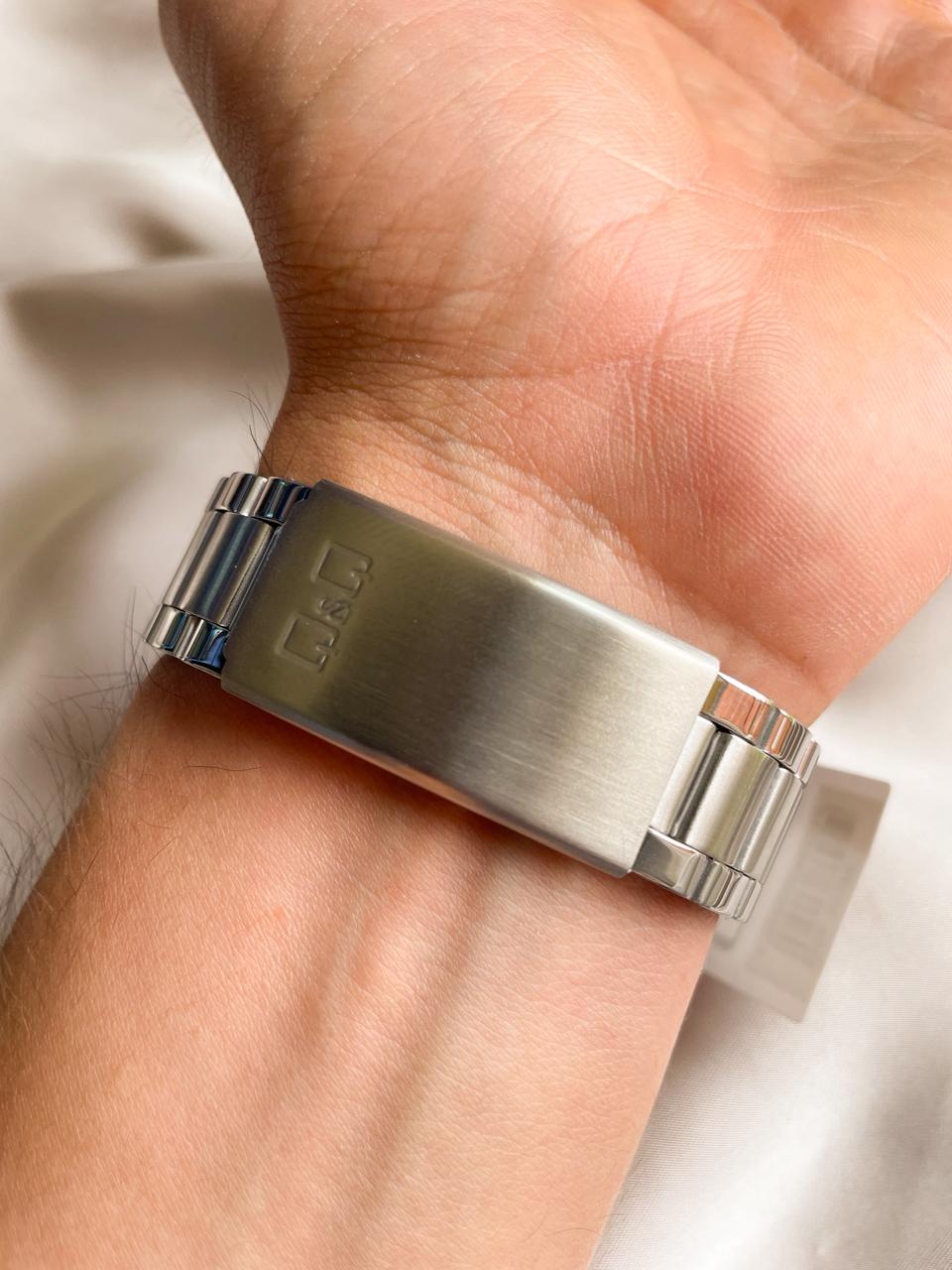 Q y Q ORIGINAL de hombre, incluye estuche, resistencia al agua: 3 BAR Water resist (NO SUMERGIBLE) 12 meses de garantía, funciones: Hora análoga, minutos, segundos, Diámetro de la pantalla 4 cm, Ancho del pulso 2 cm, Material del reloj: caja en acero horneado y pulso en acero inoxidable