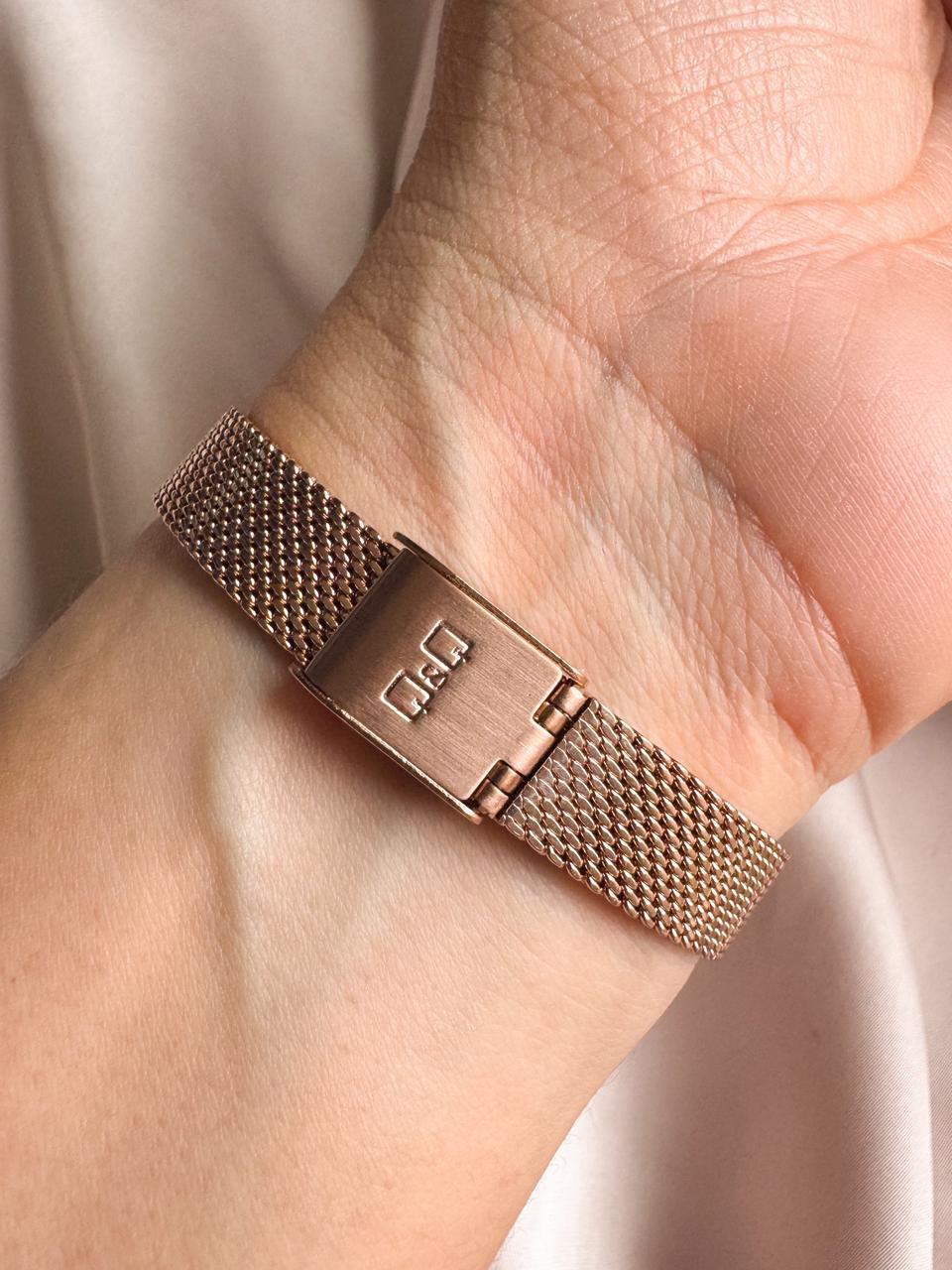 Q y Q ORIGINAL mujer, incluye estuche, resistencia al agua: 3 BAR Water resist (NO SUMERGIBLE) 12 meses de garantía, funciones: Hora análoga, minutos, segundos, Diámetro de la caja 3 cm, Ancho del pulso 1 cm, Material del reloj: caja en acero horneado y pulso en acero inoxidable.