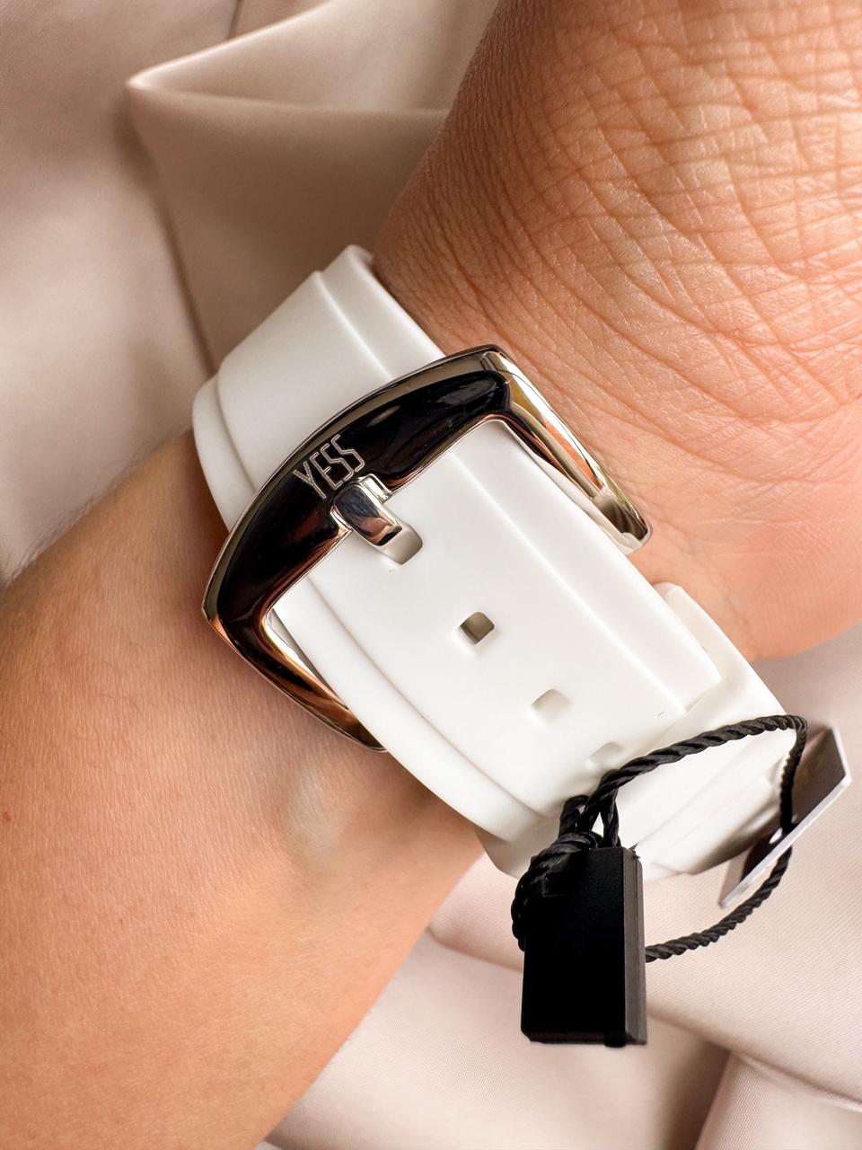 YESS ORIGINAL Mujer, incluye estuche, resistencia al agua: 5 ATM Water resist (NO SUMERGIBLE) 1 año de garantía, Funciones: 3 manecillas, Hora análoga, minutos, segundos, Calendario: Numero del día, Nombre del día, Hora militar: 24 horas, Diámetro de la caja 35 MM, Ancho del pulso, 20 mm Material del reloj: Caja en Acero y pulso en silicona
