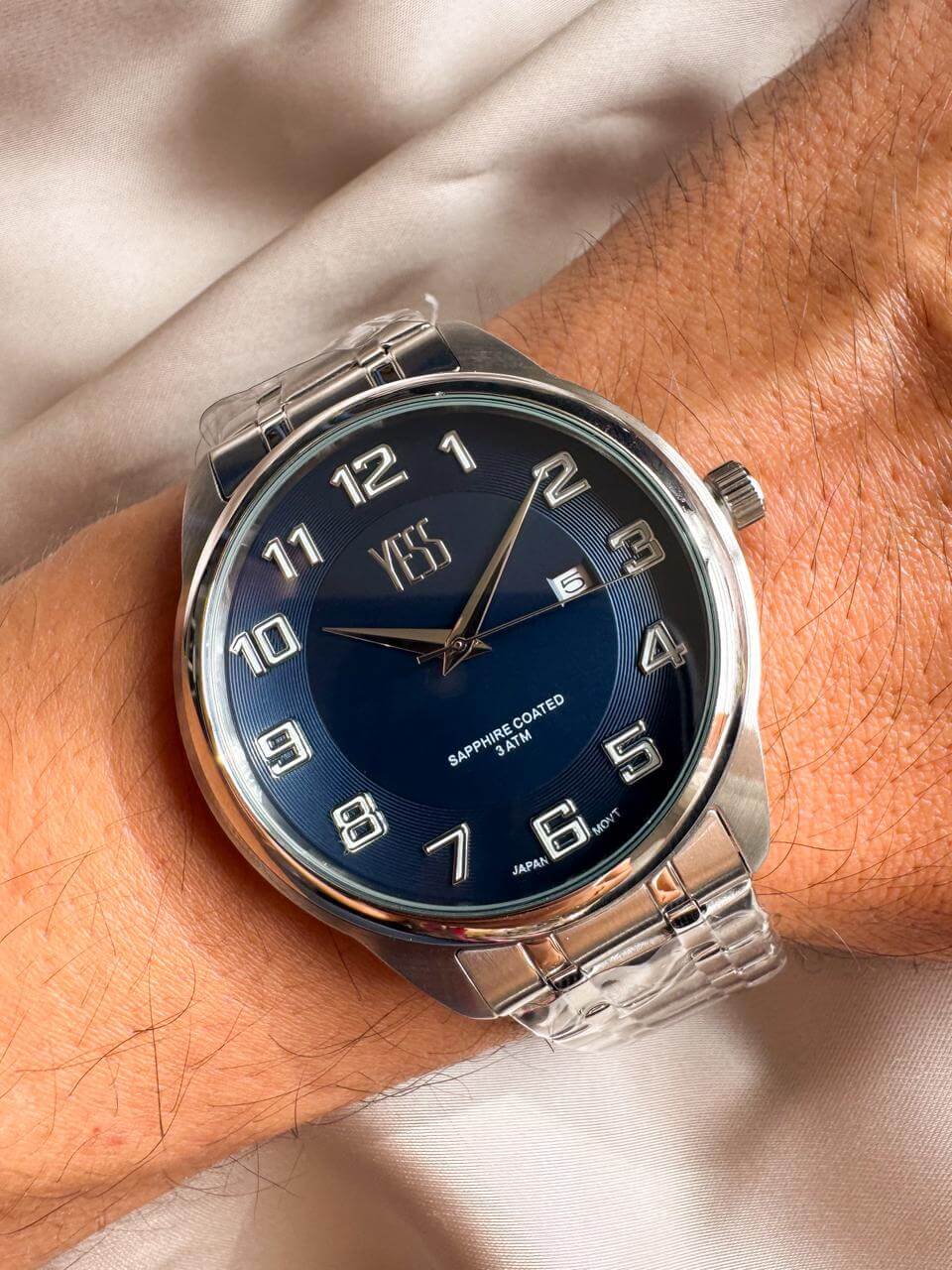 YESS ORIGINAL (fondo Azul), incluye estuche, resistencia al agua: 3 ATM Water resist (NO SUMERGIBLE) 1 año de garantía, Funciones: 3 manecillas, Hora análoga, minutos, segundos, Calendario: Numero del día, Diámetro de la caja 4.1 cm, Ancho del pulso, 1.9 cm Material del reloj: Caja en Acero y pulso en acero.